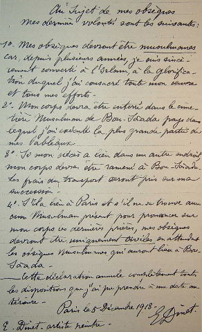 Artiste peintre et écrivain, Alphonse-Etienne Dinet est né à Paris en 1861 dans un milieu bourgeois. Son passage à l'École des Beaux-arts de Paris fut couronné de succès. Il obtient en 1884 la médaille du Salon des Arts plastiques du Palais de l'Industrie, qui lui accorde une bourse pour l'Algérie, pays qu'il avait déjà visité en 1883. Il y resta cette fois-ci cinq ans. A son retour à Paris en 1889, il présente à l'Exposition Universelle une série de toiles réalisées à Bou-Saâda, ce qui lui vaut une médaille d'argent. Subjugué par la magnificence du Sud algérien, il entreprend en 1905 un autre voyage, et s'installera à Bou-Saada, pour y vivre définitivement. Avec l'aide de son ami Slimane Ben Brahim Baâmar, il parcourt le désert et se familiarise avec les tribus nomades et bédouines, découvrant la tradition arabo-berbère. Ce qui le poussera à aimer puis à se convertir à l'Islam en 1913 en devenant Nasreddine Dinet. Il a produit une quantité d'études, de scènes, de croquis, de portraits d'une lumière flamboyante. Il a participé régulièrement à des expositions spécialement consacrées à l'orientalisme. Après un pèlerinage à La Mecque qu'il accomplit le 2 avril 1929, il meurt Le 24 décembre de la même année à Paris et sera inhumé le 12 janvier 1930 à Bou-Saada. |