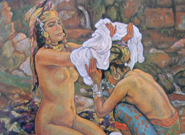 "Ne commets pas le pêché d'avarice, o Raouacha ! Le créateur t'a généreusement comblé d'exquises beautés, crois-tu que ce soit pour les dissimuler à tous les regards ? Le brodeur habile et patient, qui fait étinceler sur le cuir ou le velours des bouquets de fleurs d'or, se donnerait-il toute cette peine, si son oeuvre ne devait recevoir l'admiration du soleil et des yeux de la foule ! Mais il sait qu'elle resplendira devant eux sur les gestes du cavalier intrépide ou sur les selles et les harnachements des vainqueurs de l'air ". Etienne Dinet, Mirages |